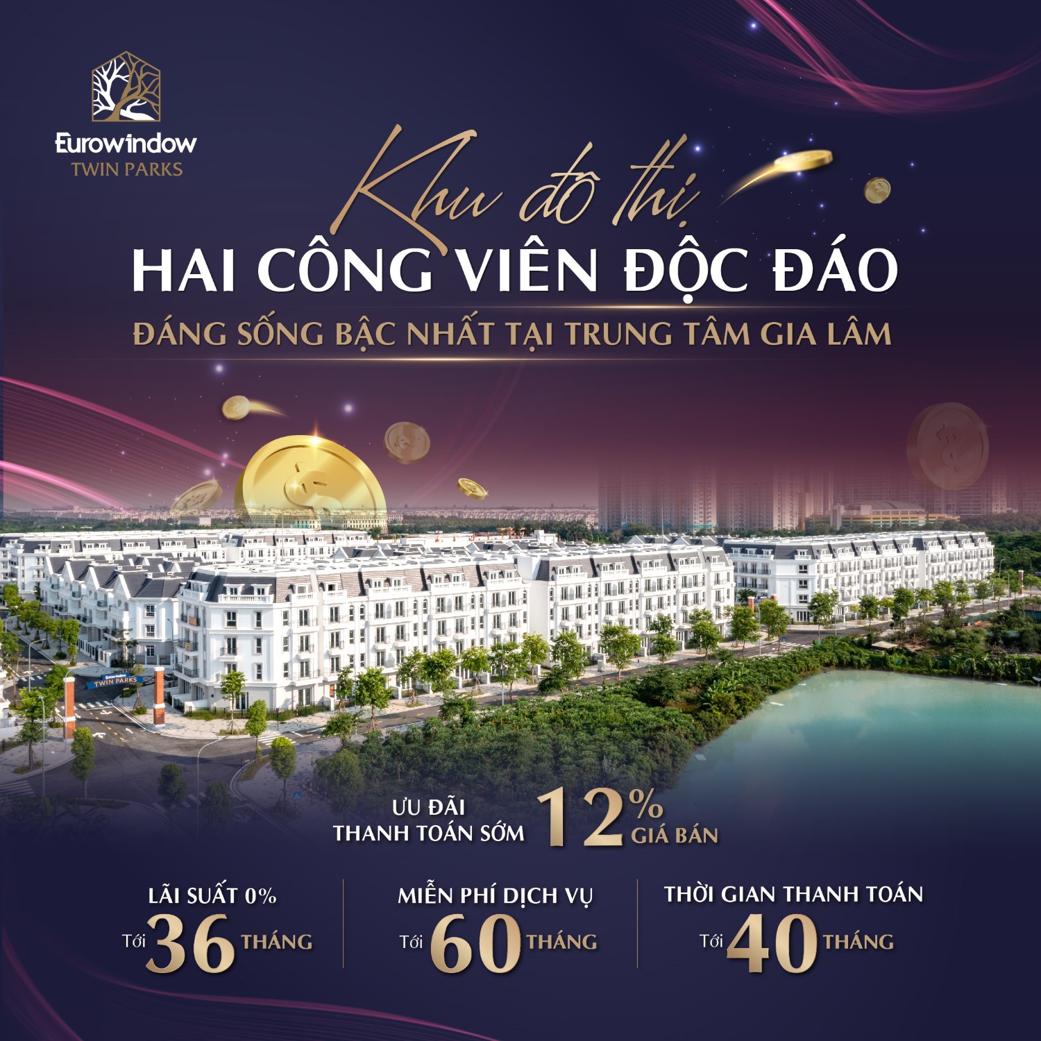 Eurowindow Twin Parks nằm đối diện công viên hồ điều hòa lớn nhất tại trung tâm Gia Lâm quy hoạch gần 31ha & sở hữu 3 khu vườn chủ đề An Viên, Lam Viên & Long Viên.